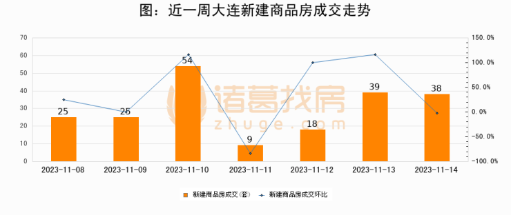 根据大连市住房保障和房屋管理局数据显示,2023年11月14日大连新建商品房成交38套,较昨日减少1套,环比下降2.6%