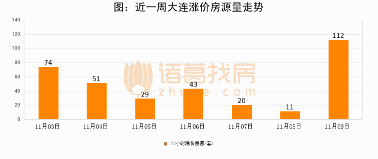 根据诸葛找房数据显示,大连24小时涨价房源量为112套,较11月08日增加101套,环比上涨918.2%。与此同时,涨价房源占比小幅扩大,业主信心有所提升。