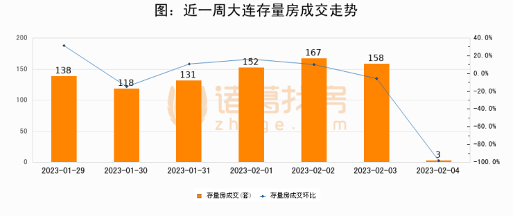 从存量房来看,2023年02月04日大连存量房单日成交3套,比昨日减少155套,环比下降98.1%。从近一周存量房成交来看,大连存量房日均成交套数为123套,其中02月02日成交量最高为167套,02月04日单日成交3套,低于近一周平均水平97.6%。