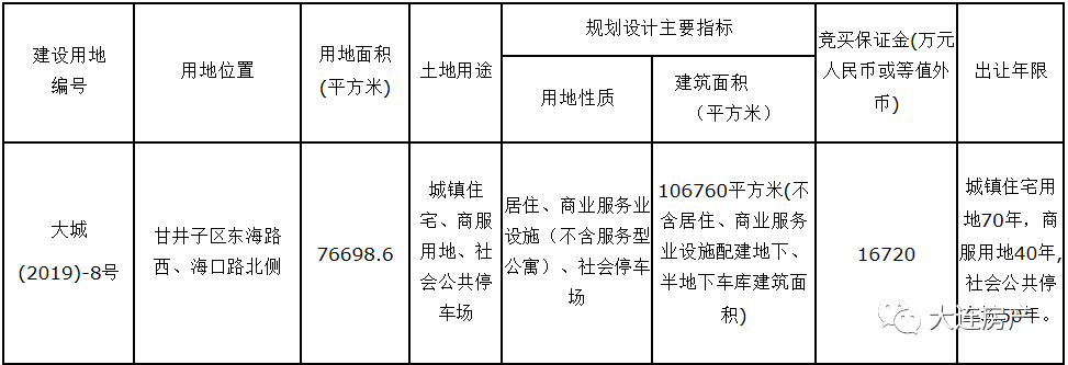 位于甘井子区东海路西、海口路北侧,编号大城 (2019)-8号宗地,将于2019年5月15日挂牌交易。