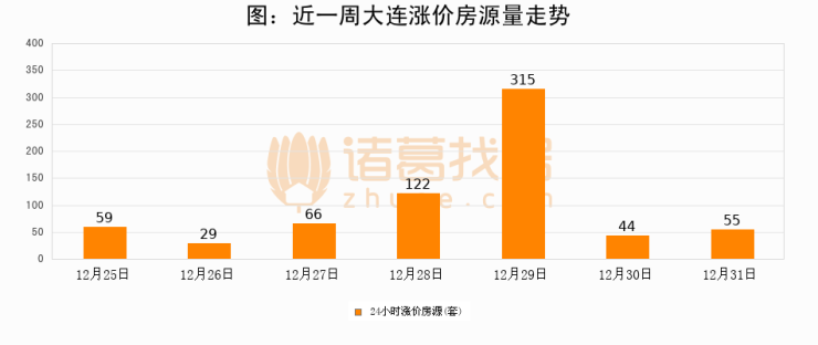 根据诸葛找房数据显示,大连24小时涨价房源量为55套,较12月30日增加11套,环比上涨25%。与此同时,涨价房源占比小幅扩大,业主信心有所提升。