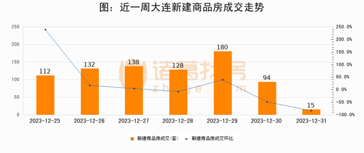 根据大连市住房保障和房屋管理局数据显示,2023年12月31日大连新建商品房成交15套,较昨日减少79套,环比下降84%