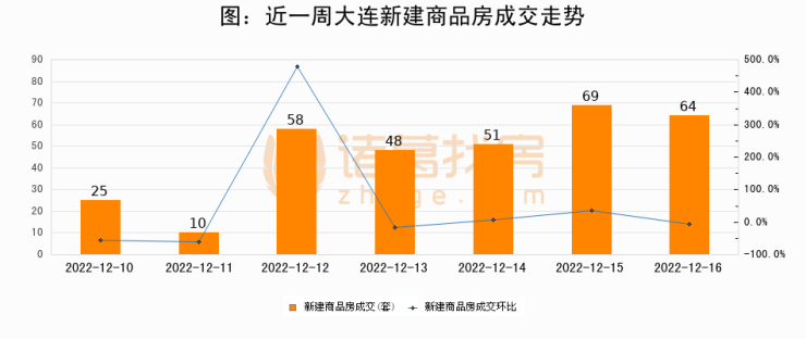 根据大连市住房保障和房屋管理局数据显示,2022年12月16日大连新建商品房成交64套,较昨日减少5套,环比下降7.2%
