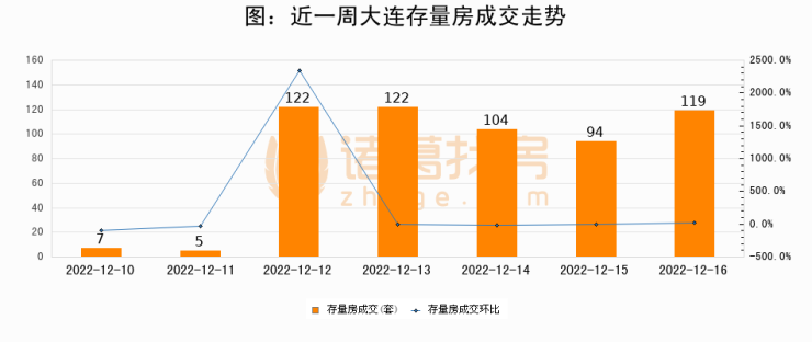 从存量房来看,2022年12月16日大连存量房单日成交119套,比昨日增加25套,环比上涨26.6%。从近一周存量房成交来看,大连存量房日均成交套数为81套,其中12月12日成交量最高为122套,12月16日单日成交119套,高于近一周平均水平46.9%。