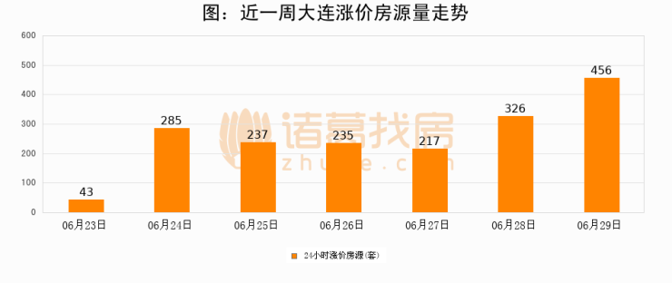 根据诸葛找房数据显示,大连24小时涨价房源量为456套,较06月28日增加130套,环比上涨39.9%。与此同时,涨价房源占比小幅扩大,业主信心有所提升。