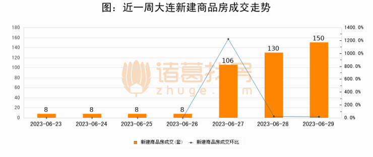 根据大连市住房保障和房屋管理局数据显示,2023年06月29日大连新建商品房成交150套,较昨日增加20套,环比上涨15.4%