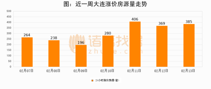 根据诸葛找房数据显示,大连24小时涨价房源量为385套,较02月12日增加16套,环比上涨4.3%。与此同时,涨价房源占比小幅扩大,业主信心有所提升。
