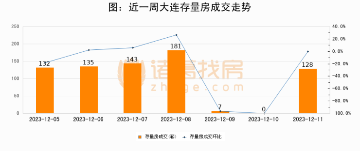 从存量房来看,2023年12月11日大连存量房单日成交128套,比昨日增加128套,环比上涨0%。从近一周存量房成交来看,大连存量房日均成交套数为103套,12月11日单日成交128套,高于近一周平均水平24.3%。