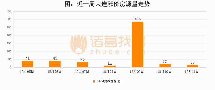 根据诸葛找房数据显示,大连24小时涨价房源量为17套,较12月10日减少5套,环比下降22.7%。与此同时,涨价房源占比小幅回落,对于购房者来说是一个入市窗口期,购房者可抓住时机入市。