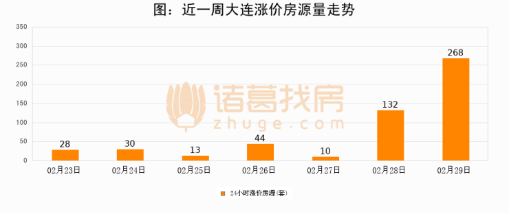 根据诸葛找房数据显示,大连24小时涨价房源量为268套,较02月28日增加136套,环比上涨103%。与此同时,涨价房源占比小幅扩大,业主信心有所提升。
