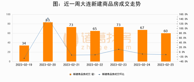 根据大连市住房保障和房屋管理局数据显示,2023年02月25日大连新建商品房成交60套,较昨日减少7套,环比下降10.4%。近一周大连新建商品房日均成交65套,其中,02月20日成交量最高为83套。02月25日单日成交60套,低于近一周平均水平7.7%。