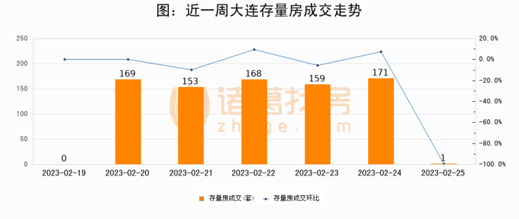 从存量房来看,2023年02月25日大连存量房单日成交1套,比昨日减少170套,环比下降99.4%。从近一周存量房成交来看,大连存量房日均成交套数为117套,其中02月24日成交量最高为171套,02月25日单日成交1套,低于近一周平均水平99.1%。