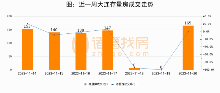 从存量房来看,2023年11月20日大连存量房单日成交165套,比昨日增加165套,环比上涨0%。从近一周存量房成交来看,大连存量房日均成交套数为107套,11月20日单日成交165套,高于近一周平均水平54.2%。
