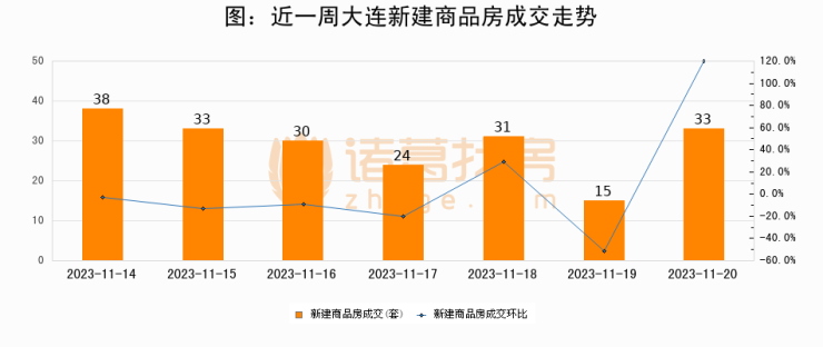 根据大连市住房保障和房屋管理局数据显示,2023年11月20日大连新建商品房成交33套,较昨日增加18套,环比上涨120%