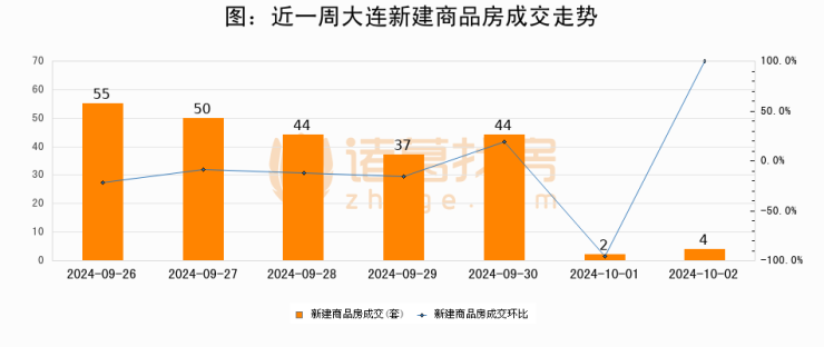 根据大连市住房保障和房屋管理局数据显示,2024年10月02日大连新建商品房成交4套,较昨日增加2套,环比上涨100%