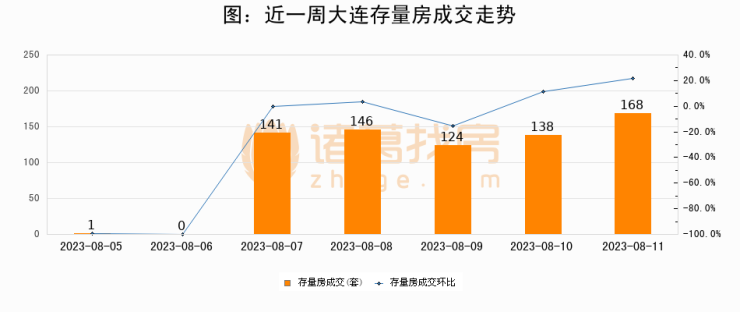 从存量房来看,2023年08月11日大连存量房单日成交168套,比昨日增加30套,环比上涨21.7%。从近一周存量房成交来看,大连存量房日均成交套数为102套,08月11日单日成交168套,高于近一周平均水平64.7%。