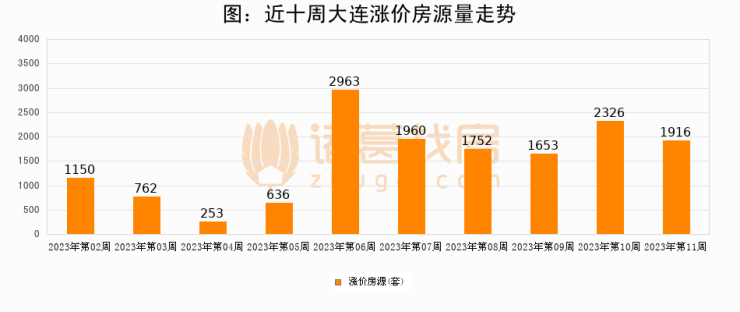 从调价房源来看,第11周大连涨价房源1916套,较上周下降17.6%。与此同时,11周涨价房源占比回落3.2个百分点,业主信心小幅波动,购房者可则需入市。