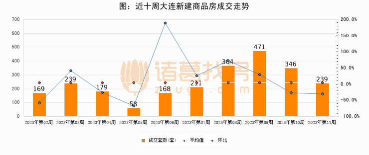 进入2023年第11周(03月06日-03月12日),大连新建商品房成交239套,较上周减少107套,环比下降30.9%