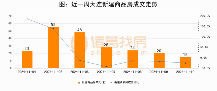 根据大连市住房保障和房屋管理局数据显示,2024年11月10日大连新建商品房成交15套,较昨日减少5套,环比下降25%