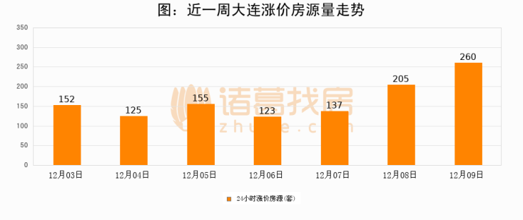 根据诸葛找房数据显示,大连24小时涨价房源量为260套,较12月08日增加55套,环比上涨26.8%。与此同时,涨价房源占比小幅扩大,业主信心有所提升。