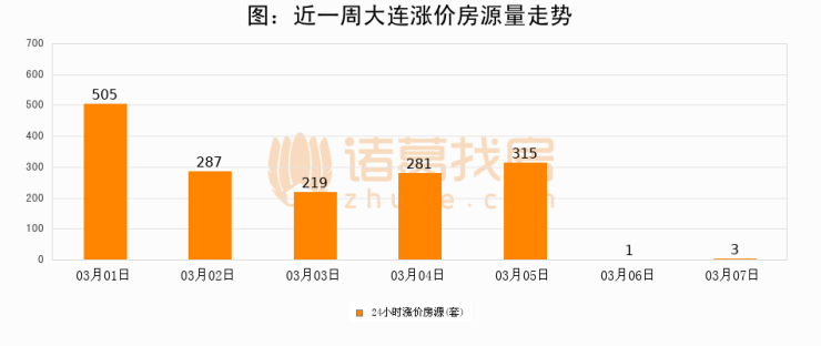 根据诸葛找房数据显示,大连24小时涨价房源量为3套,较03月06日增加2套,环比上涨200%。与此同时,涨价房源占比小幅扩大,业主信心有所提升。