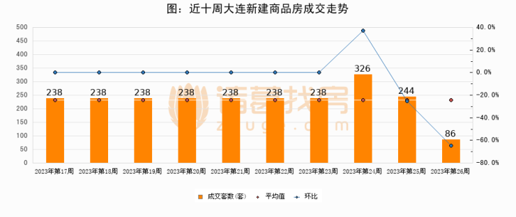 进入2023年第26周(06月19日-06月25日),大连新建商品房成交86套,较上周减少158套,环比下降64.8%