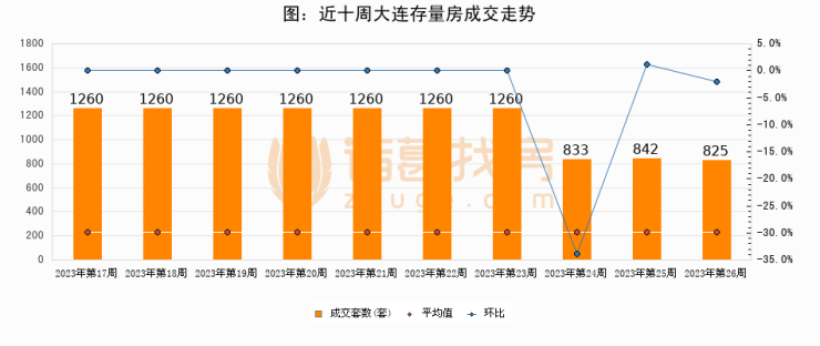 存量房方面,第26周大连存量房成交825套,较上周减少17套,环比下降2%。从近十周成交走势来看,周均成交套数为1132套,本周低于平均水平27.1%。