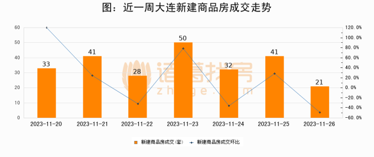 根据大连市住房保障和房屋管理局数据显示,2023年11月26日大连新建商品房成交21套,较昨日减少20套,环比下降48.8%
