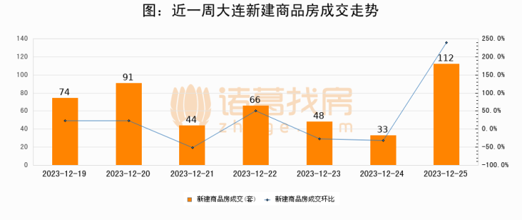 根据大连市住房保障和房屋管理局数据显示,2023年12月25日大连新建商品房成交112套,较昨日增加79套,环比上涨239.4%