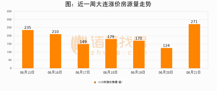 根据诸葛找房数据显示,大连24小时涨价房源量为271套,较06月20日增加147套,环比上涨118.5%。与此同时,涨价房源占比小幅扩大,业主信心有所提升。