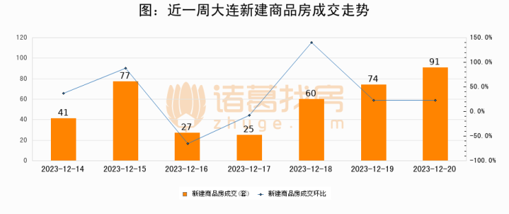 根据大连市住房保障和房屋管理局数据显示,2023年12月20日大连新建商品房成交91套,较昨日增加17套,环比上涨23%
