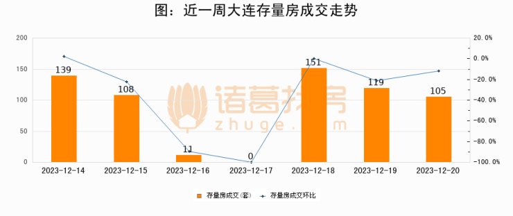 从存量房来看,2023年12月20日大连存量房单日成交105套,比昨日减少14套,环比下降11.8%。从近一周存量房成交来看,大连存量房日均成交套数为90套,12月20日单日成交105套,高于近一周平均水平16.7%。