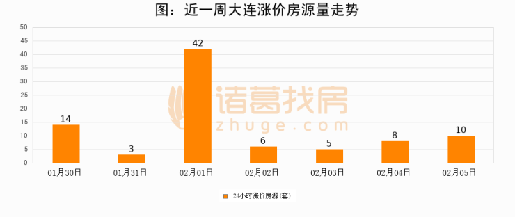根据诸葛找房数据显示,大连24小时涨价房源量为10套,较02月04日增加2套,环比上涨25%。与此同时,涨价房源占比小幅扩大,业主信心有所提升。