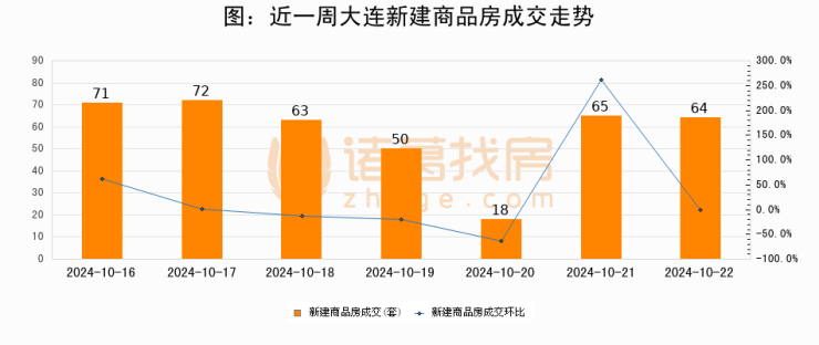 根据大连市住房保障和房屋管理局数据显示,2024年10月22日大连新建商品房成交64套,较昨日减少1套,环比下降1.5%