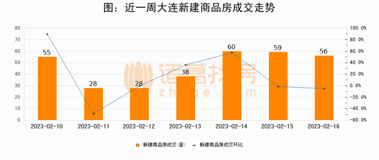 根据大连市住房保障和房屋管理局数据显示,2023年02月16日大连新建商品房成交56套,较昨日减少3套,环比下降5.1%