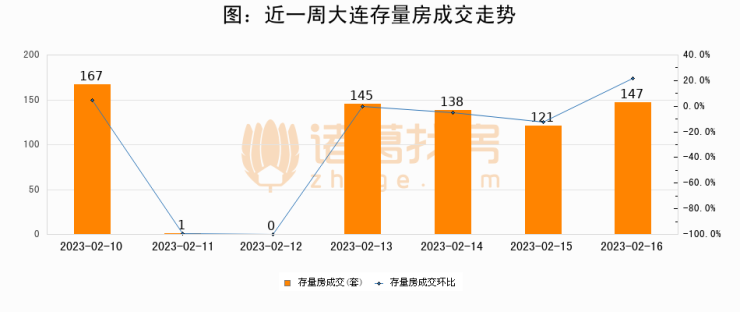 从存量房来看,2023年02月16日大连存量房单日成交147套,比昨日增加26套,环比上涨21.5%。从近一周存量房成交来看,大连存量房日均成交套数为102套,其中02月10日成交量最高为167套,02月16日单日成交147套,高于近一周平均水平44.1%。