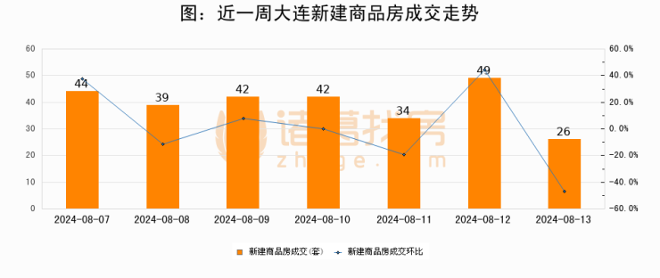 根据大连市住房保障和房屋管理局数据显示,2024年08月13日大连新建商品房成交26套,较昨日减少23套,环比下降46.9%