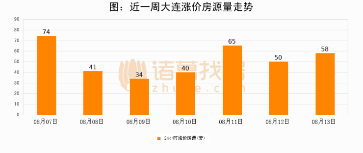 根据诸葛找房数据显示,大连24小时涨价房源量为58套,较08月12日增加8套,环比上涨16%。与此同时,涨价房源占比小幅扩大,业主信心有所提升。