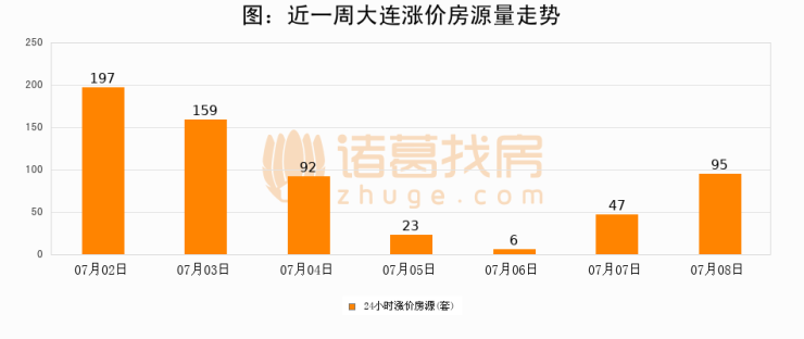 根据诸葛找房数据显示,大连24小时涨价房源量为95套,较07月07日增加48套,环比上涨102.1%。与此同时,涨价房源占比小幅扩大,业主信心有所提升。