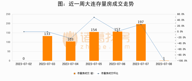 从存量房来看,2023年07月08日大连存量房单日成交1套,比昨日减少196套,环比下降99.5%。从近一周存量房成交来看,大连存量房日均成交套数为106套,07月08日单日成交1套,低于近一周平均水平99.1%。