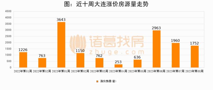 从调价房源来看,第8周大连涨价房源1752套,较上周下降10.6%。与此同时,8周涨价房源占比回落1.7个百分点,业主信心小幅波动,购房者可则需入市。