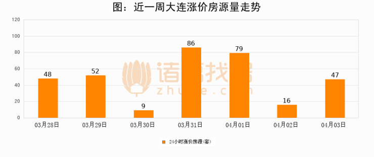 根据诸葛找房数据显示,大连24小时涨价房源量为47套,较04月02日增加31套,环比上涨193.8%。与此同时,涨价房源占比小幅扩大,业主信心有所提升。