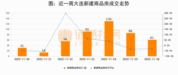 根据大连市住房保障和房屋管理局数据显示,2022年11月26日大连新建商品房成交61套,较昨日减少25套,环比下降29.1%