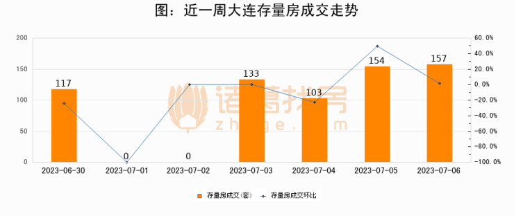 从存量房来看,2023年07月06日大连存量房单日成交157套,比昨日增加3套,环比上涨1.9%。从近一周存量房成交来看,大连存量房日均成交套数为94套,07月06日单日成交157套,高于近一周平均水平67%。