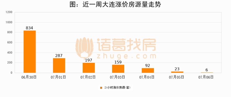 根据诸葛找房数据显示,大连24小时涨价房源量为6套,较07月05日减少17套,环比下降73.9%。与此同时,涨价房源占比小幅回落,对于购房者来说是一个入市窗口期,购房者可抓住时机入市。