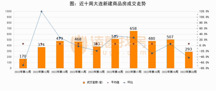 进入2022年第50周(12月05日-12月11日),大连新建商品房成交293套,较上周减少214套,环比下降42.2%
