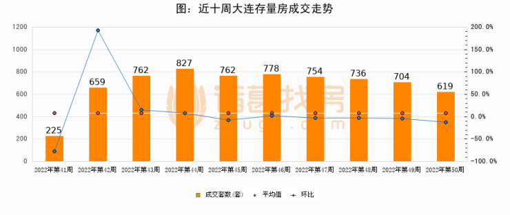 存量房方面,第50周大连存量房成交619套,较上周减少85套,环比下降12.1%。从近十周成交走势来看,周均成交套数为682套,本周低于平均水平9.2%。