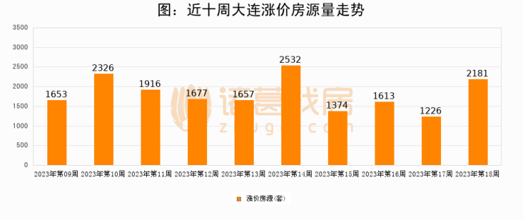 从调价房源来看,第18周大连涨价房源2181套,较上周上涨77.9%。与此同时,18周涨价房源占比提升3.5个百分点,业主信心持续恢复。