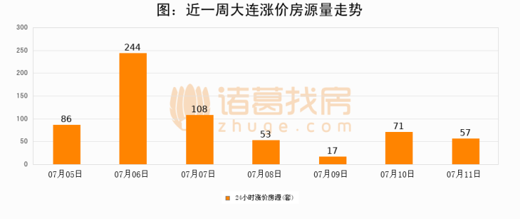 根据诸葛找房数据显示,大连24小时涨价房源量为57套,较07月10日减少14套,环比下降19.7%。与此同时,涨价房源占比小幅回落,对于购房者来说是一个入市窗口期,购房者可抓住时机入市。