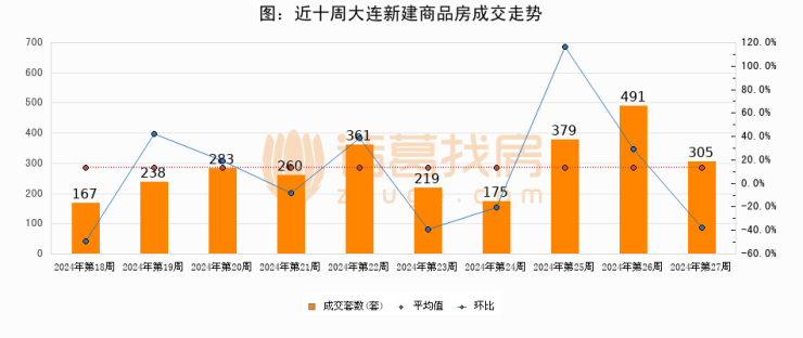 进入2024年第27周(07月01日-07月07日),大连新建商品房成交305套,较上周减少186套,环比下降37.9%
